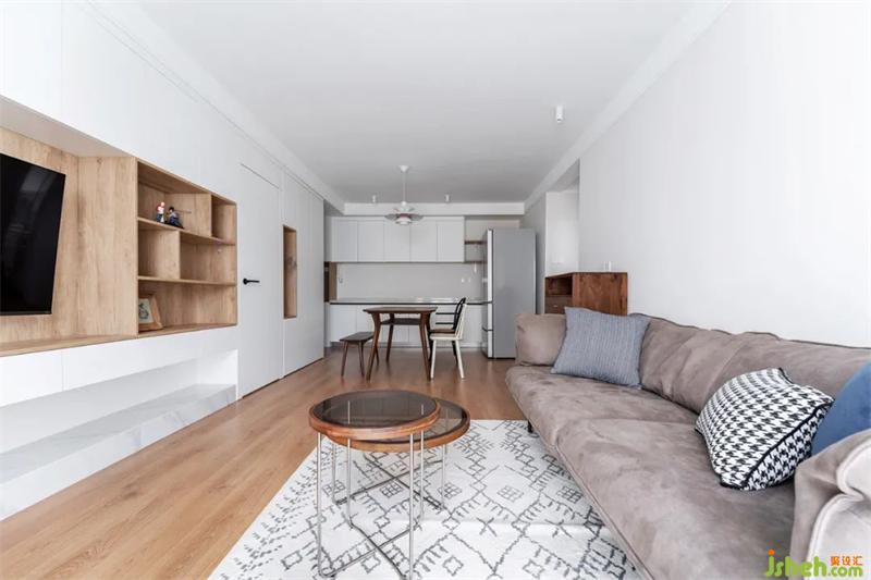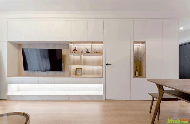 客廳增加了整排的綜合收納空間,并且與餐廳背景相連接。形成統(tǒng)一的視覺(jué)效果,延伸了空間感。