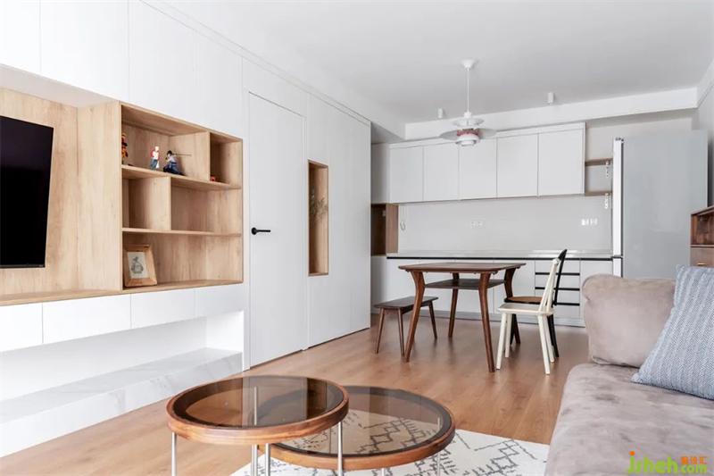 電視背景墻,放置65寸電視,旁邊并且放置手辦區(qū)域。天津裝修設(shè)計(jì)隱形門過(guò)渡客餐廳,讓空間完整統(tǒng)一。