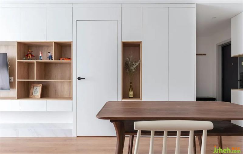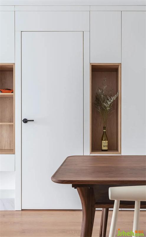 餐廳相對(duì)應(yīng)的收納柜,有藏有露。原設(shè)計(jì)是想放置大型樂(lè)高空間,無(wú)意之間放置了一個(gè)花瓶,比起樂(lè)高,使空間更加自然,更加有生機(jī)。開放格也做了套色,與電視墻相呼應(yīng)。