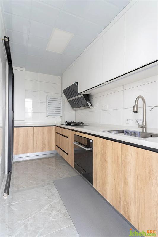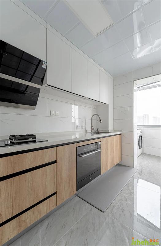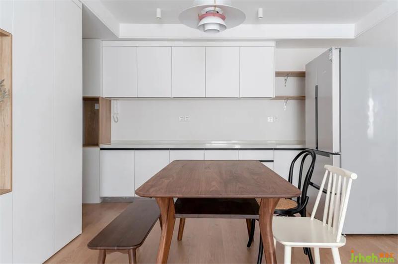 原有戶型為一字型櫥柜,天津裝修設(shè)計(jì)為了增加儲(chǔ)物和操作臺(tái)面,通過(guò)更改門洞位置,增加了一排櫥柜,更改為L(zhǎng)型布局。為了阻隔油煙問(wèn)題,增加一組長(zhǎng)虹玻璃推拉門作為隔斷。