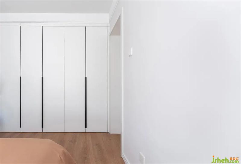 床頭預(yù)留了小壁燈功能,為了方便起夜,原有壁燈上面是空調(diào),我們結(jié)合現(xiàn)場情況,改到了對面,這樣床的背景墻就比較整體和干凈了。放置了整排落地衣柜,滿足居家生活的儲存。頂面局部作了吊頂,柜子也能直接到頂。這樣整體感會更好,床的擺放也很居中,讓周邊的活動空間寬敞不少。