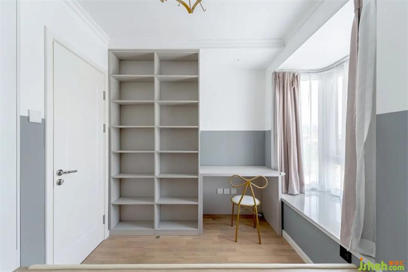 兒童房的一側(cè)定制了整高書架,與書桌組成一個(gè)一體式的學(xué)習(xí)區(qū)。飄窗可以作為一個(gè)放松休閑區(qū),學(xué)習(xí)累了可以坐到窗邊,欣賞窗外的風(fēng)景。