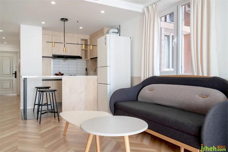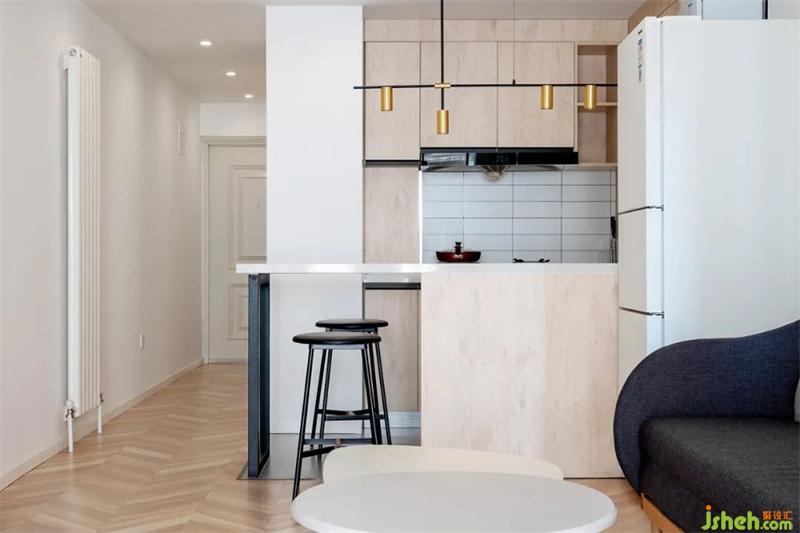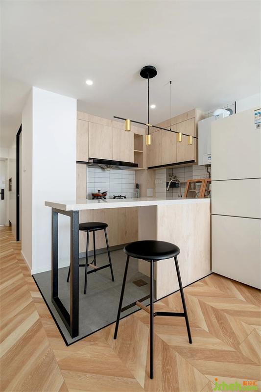 2.廚房區(qū)域打開后,最大化釋放空間,也滿足一定的收納需求。從櫥柜延伸一段吧臺(tái),可以滿足基本就餐。