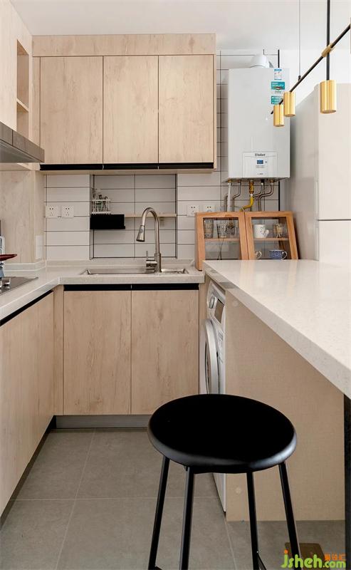 吧臺(tái)臺(tái)面做了高低處理,一是為了在吧臺(tái)下內(nèi)嵌洗衣機(jī),而還能提高了吧臺(tái)使用的舒適度。操作臺(tái)延伸后,還增加了黑色支架,加固臺(tái)面的穩(wěn)定性。