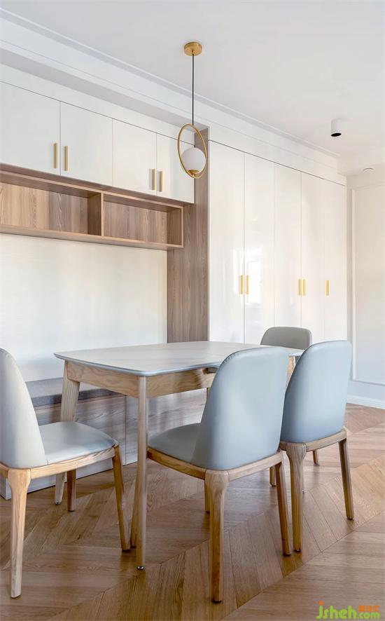 卡座形式的就餐區(qū),上下都可以儲物,餐桌也可以緊靠一邊,節(jié)省不少空間。