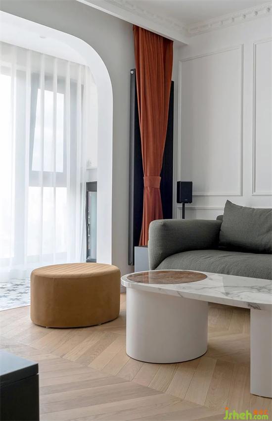 經(jīng)紗簾過(guò)濾過(guò)的光線更加柔和,大理石茶幾的臺(tái)面讓空間的材質(zhì)更有層次。