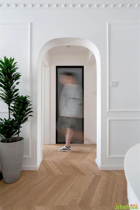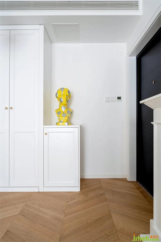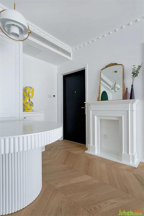 優(yōu)化后的玄關(guān)增加了大量儲物空間,純白色的壁爐+銅鏡,營造法式獨有的裝修浪漫氛圍。