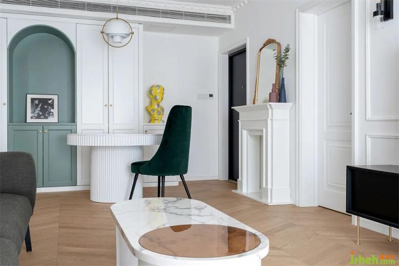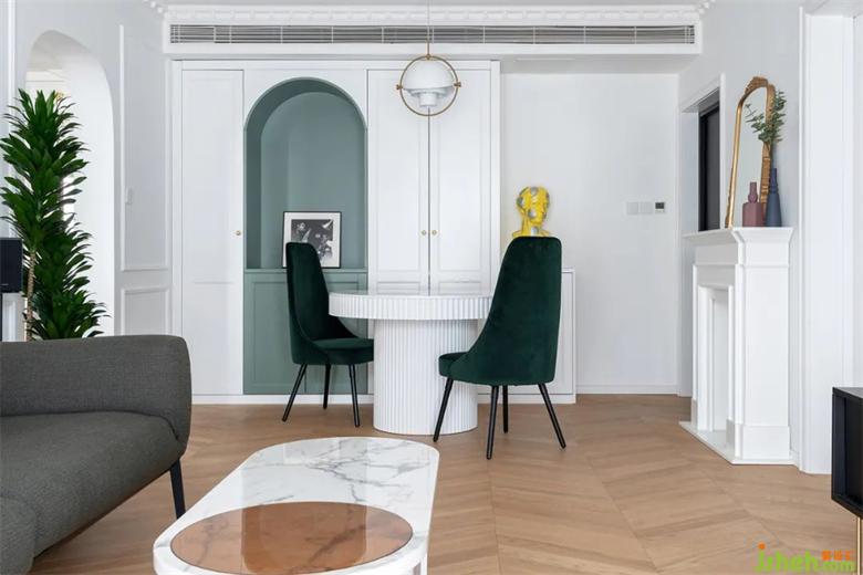 在白色的儲物柜中,內(nèi)嵌入了牛油果綠的餐邊格,裝修打破常規(guī)增強(qiáng)視覺感受,圓形的餐桌讓動線更流暢。