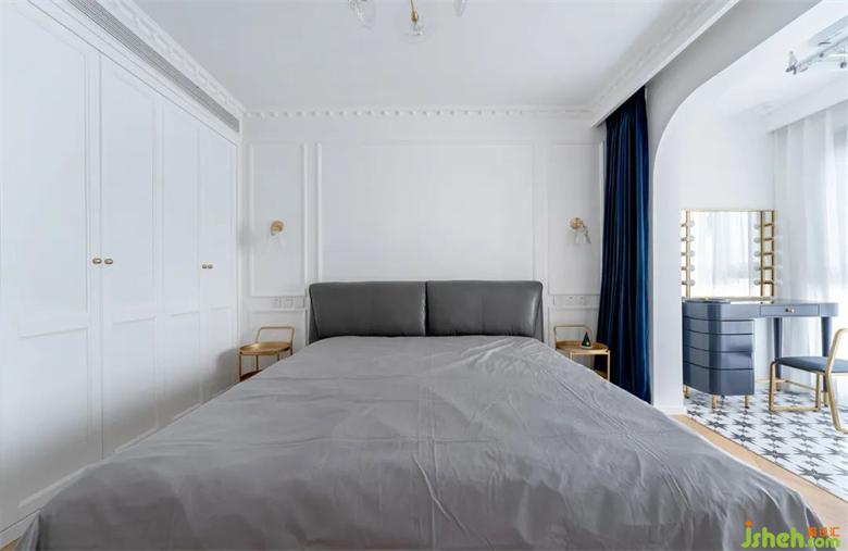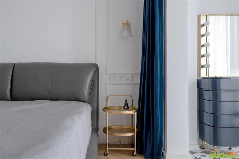 床頭旁選用了可靈活推拉的盤式儲(chǔ)物,拉絲黃銅的質(zhì)感+深藍(lán)色的窗簾組合高級(jí)感十足。