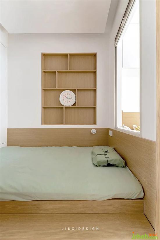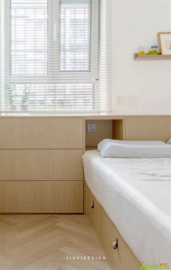 臥室的床頭做成一組柜子,裝修設計具備收納,也加寬了窗臺,有一種飄窗的感覺。