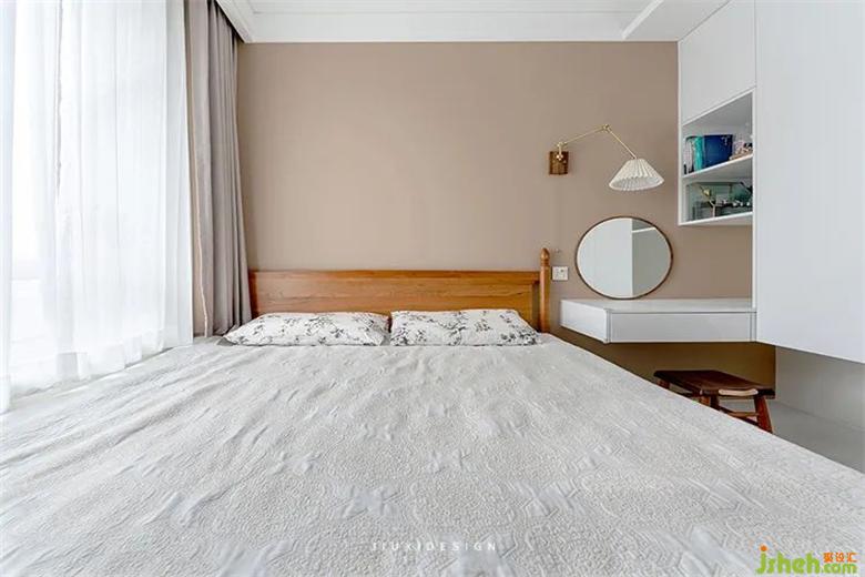 衣柜和梳妝臺一體化的設(shè)計干凈整潔,墻面的壁燈不僅作為床頭燈的使用,裝修設(shè)計還可以作為梳妝燈。小巧的壁燈也為臥室空間帶來精致,充滿個性的視覺趣味。