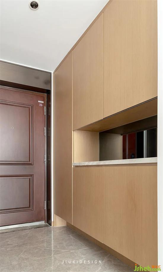 玄關(guān)的鞋帽柜是精裝房原有定制的,裝修設(shè)計為了完善門廳的功能,我們在柜子內(nèi)加入了鏡子的設(shè)置,方便出門前的整理使用。