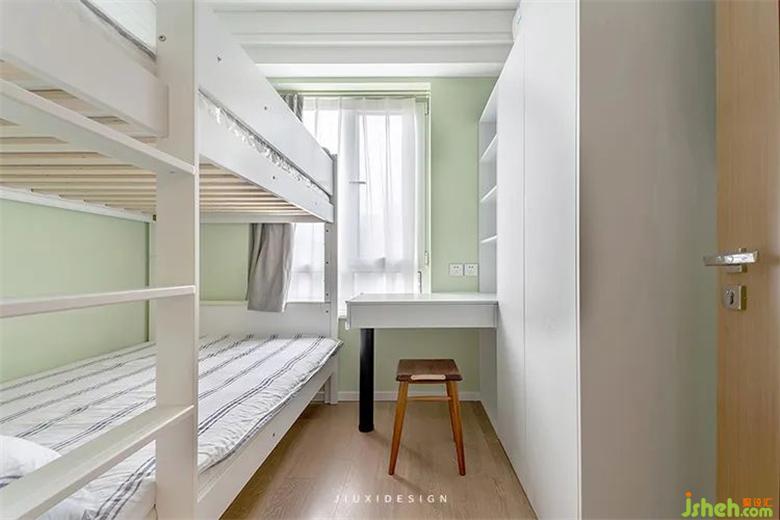 兒童房上下床不僅實用性很強,裝修設(shè)計還能為孩子帶來一點趣味性。(現(xiàn)在阿姨陪伴孩子睡下鋪,孩子長大些后睡上鋪)衣柜延伸出來的書桌,也為以后孩子寫作業(yè)做了提前的預(yù)留。