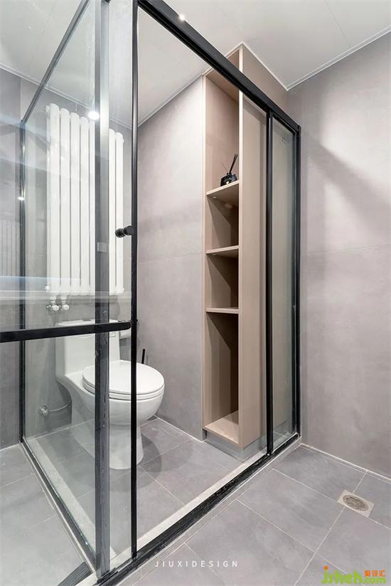 浴室空間做了干濕分區(qū),淋浴間與馬桶間之間的玻璃隔斷,防止洗澡時(shí),噴淋的水濺出到外面。
