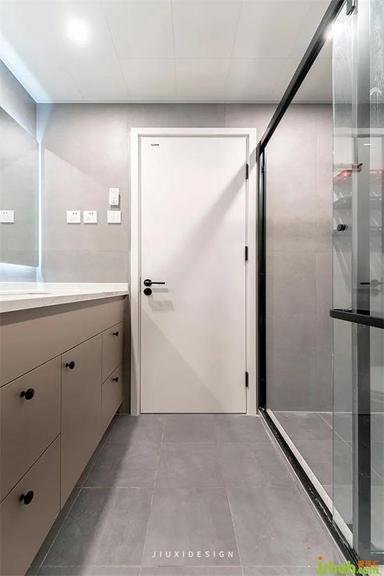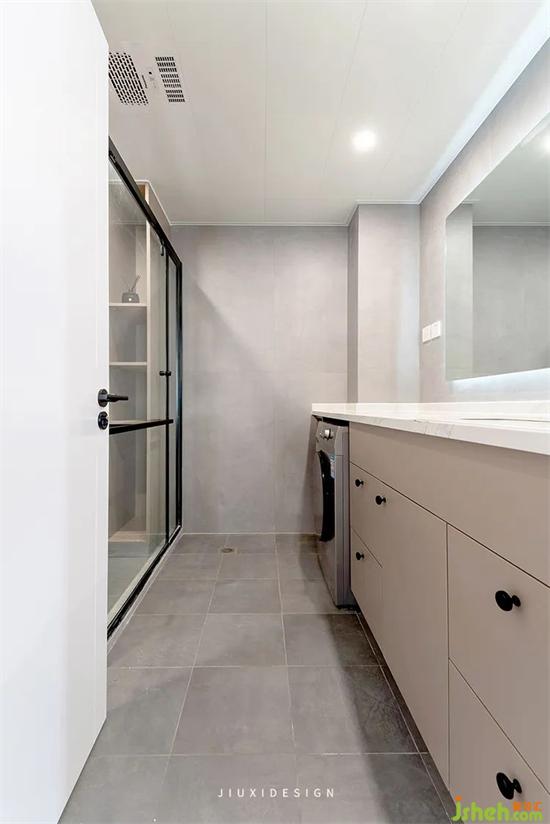 衛(wèi)生間的墻地面使用灰色啞光磚,讓空間完整簡(jiǎn)單。裝修定制的浴室柜與墻面嚴(yán)絲合縫,不會(huì)有一絲絲的空間浪費(fèi)。