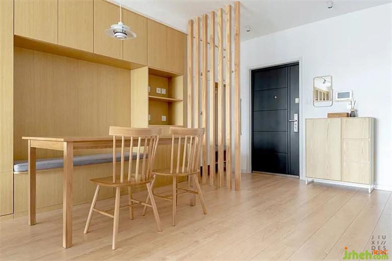 餐廳巧妙的利裝修設(shè)計用了卡座的形式和柜體融在一起,對于進門這塊“交通要道”起到了至關(guān)重要的作用。這樣變相的把動線都歸納入一邊,方便其他功能區(qū)的進出。