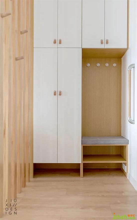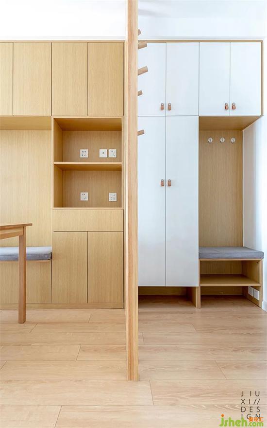 入戶的鞋帽柜和客餐廳柜,做了顏色區(qū)分。柜體深度裝修設(shè)計也有區(qū)別,鞋帽柜的要更深一些,方便大件衣物的放置。最下面都預(yù)留了放鞋子空間,右下角這是掃地機器人的位置。