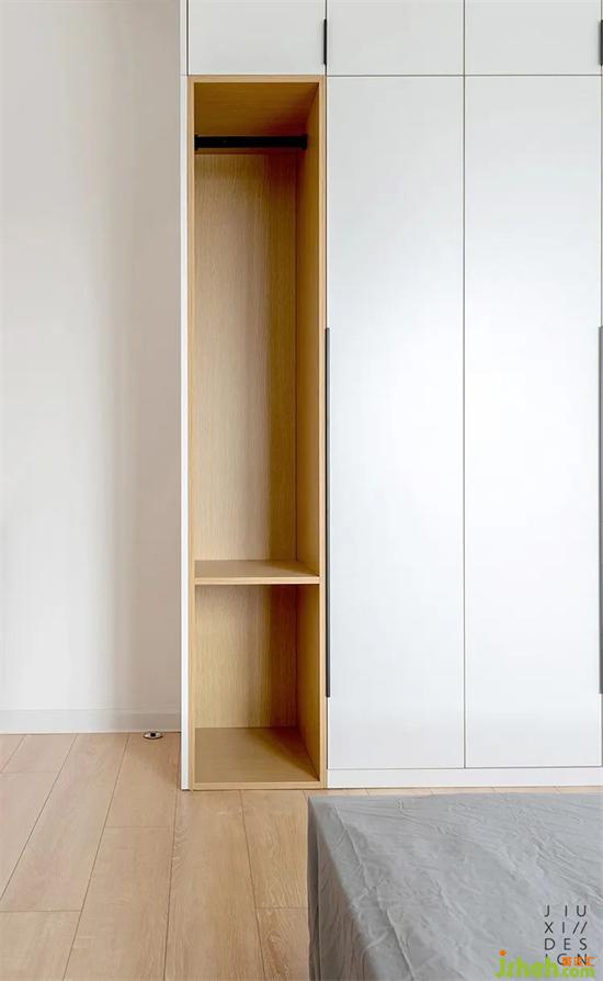 主臥衣柜最左邊的開放格,預(yù)留夜晚休息放衣物的空間裝修設(shè)計。右邊都是通頂?shù)囊鹿?,柜體上面預(yù)留了10公分的平面吊頂,這樣柜體通頂后沒有大的縫隙,收口也好處理。