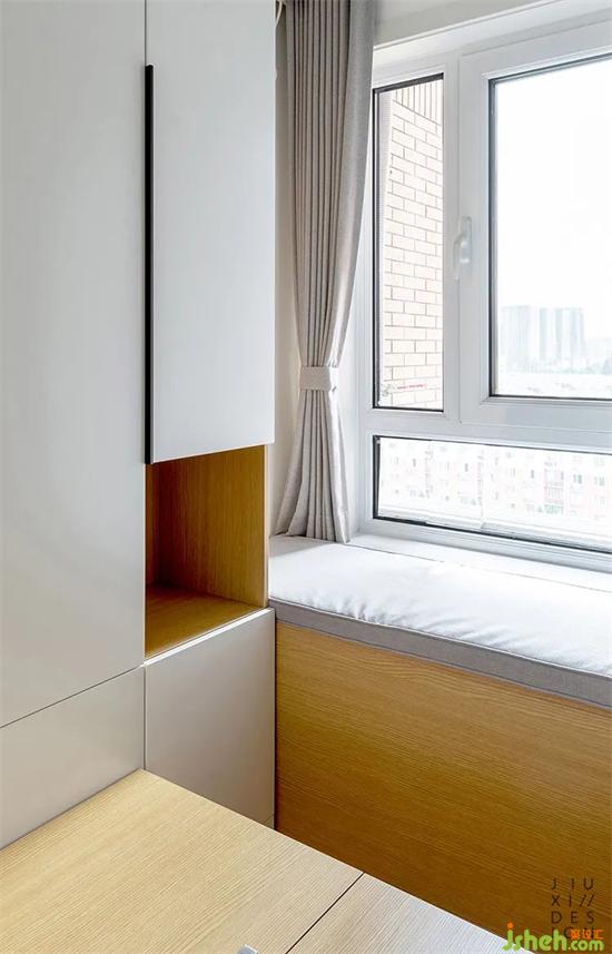 現(xiàn)在的飄窗,其前身原型是一處很小很小的陽臺,利用率著實很低。直接裝修設(shè)計成了木制飄窗,平時既可以當(dāng)作休閑看書的區(qū)域,下面也能滿足一些常用物品的存放。