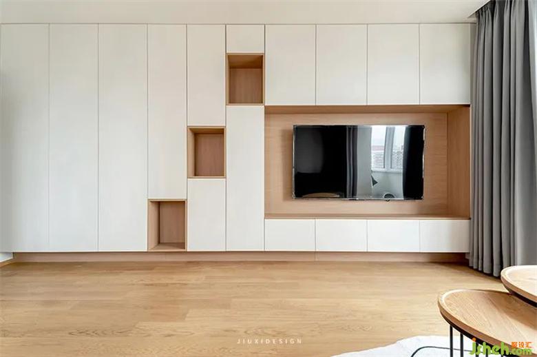電視柜劃分出幾組區(qū)域,用于滿足不同物品分類收室內(nèi)設(shè)計(jì)師納的需求。原木的跳色開放格,打破整面柜形式的呆板。抬高15公分的懸空空間,杜絕衛(wèi)生死角,讓空氣和視線自由貫穿一切,能夠更好的流通和延伸。