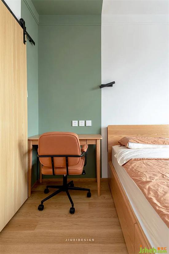 由于屋主有在家偶爾室內(nèi)設(shè)計(jì)師辦公的需求,在床頭增加了辦公區(qū),床品和椅子的配色,統(tǒng)一空間色調(diào),擁有變化還不失單調(diào)。