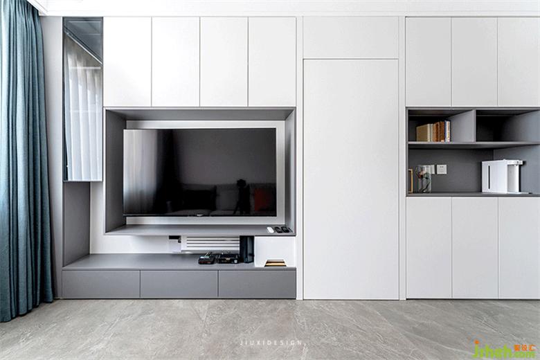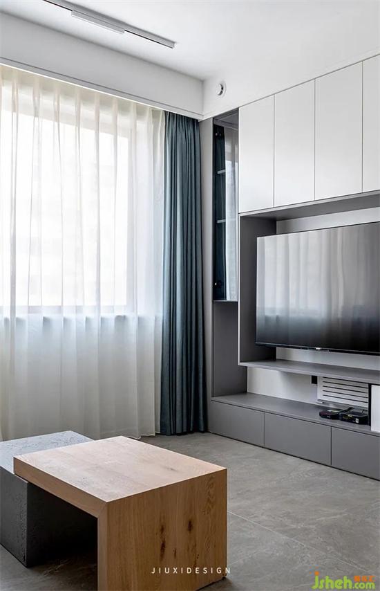 整個(gè)客廳與餐廳合為一體,互相融合。整面的柜子隱藏了餐桌和主臥的門(mén),使整個(gè)空間連貫一體,大氣整齊。從色彩和氛圍的營(yíng)造上,我們選用了低飽和度及大量的中性灰色,去覆蓋空間。營(yíng)造出一種整潔,冷靜的高室內(nèi)設(shè)計(jì)級(jí)感。