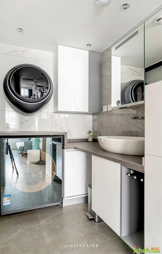 這里是衛(wèi)生間干區(qū)的區(qū)域,也是放置洗衣機的家政區(qū)空間。洗烘一體機內嵌,熨燙區(qū)域預留,壁掛洗衣機藏起所有管線,室內設計都在詮釋簡潔的氛圍。素雅清新的色調,兼顧空間功能與收納,在步入空間的同時,擁有利落優(yōu)雅的感覺。