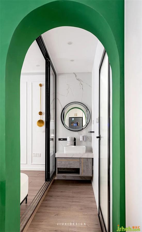 圓拱形門洞,讓層高有了向上的效果。墨綠色奠定了動線的協(xié)調(diào)感,裝修設(shè)計(jì)增添復(fù)古時尚的韻味。