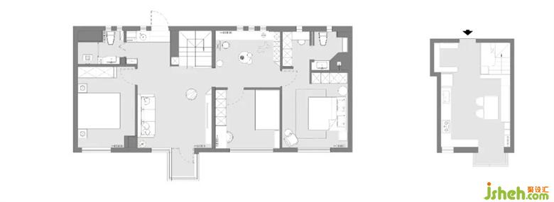 1.門廳規(guī)劃了系統(tǒng)的收納空間,樓梯改動了朝向,增加了收納的同時,連接了樓上樓下的通風(fēng)和光影,