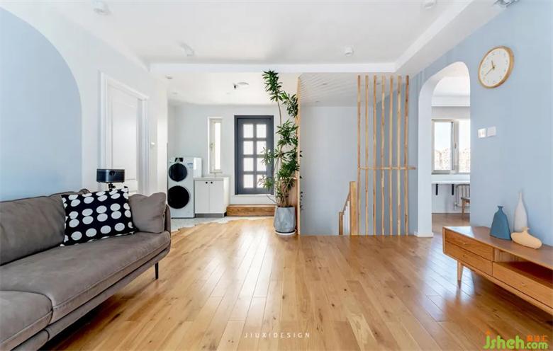 客廳也是整個二層的轉(zhuǎn)換空間,連接著樓下和樓上室內(nèi)裝修以及陽臺。樓梯處做到頂?shù)臋跅U,也為安全性上提供保障。沙發(fā)背景墻的弧形和書房的弧形門洞做呼應(yīng),整個煙藍(lán)色和雙雪白做背景。加入溫潤的木色,讓整個空間柔和且靜謐。