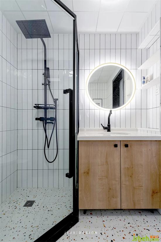 客衛(wèi)同樣做了干濕分離,浴室柜臺中盆的設(shè)計,室內(nèi)裝修解決了深度尺寸太小的問題。豎向鋪貼長條小白磚,起到給小空間延伸高度的效果。壁龕滿足了淋浴區(qū)域,對洗漱用品收納。