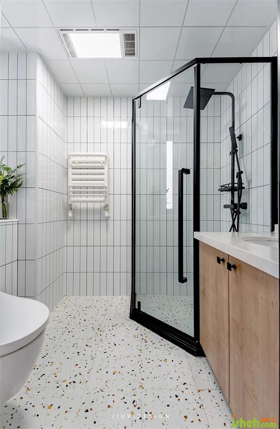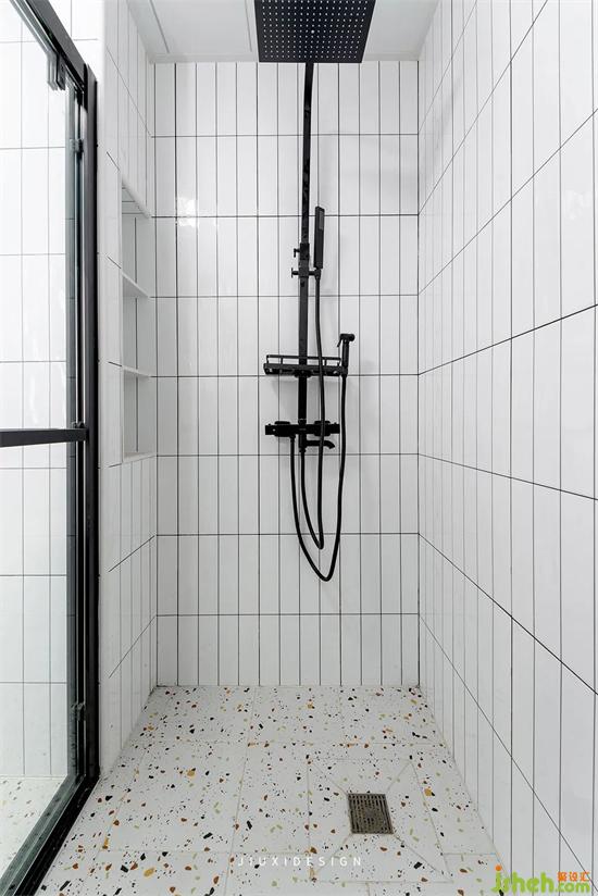 鉆石型的黑色邊框淋浴房,與白色的墻面形成對比,室內(nèi)裝修顯得格外高級。浴室柜旁做了單獨的收納架,方便存放洗漱用品。