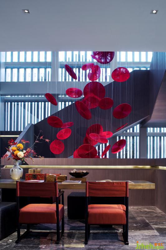 設計以結(jié)合唐山絲綢之路及唐朝貴族團扇文化為設計元素,設計的紅色吊飾,表達出吉祥貴族氣質(zhì)。陽光透過玻璃窗,讓光線在空間里若有似無的流動,虛實相間里給予洽談者一種全新的感官體驗。掛飾上的肌理為視覺與觸覺帶來記憶,也為觀者帶來遐想:亦或朝暉,亦或晚霞。設計公司