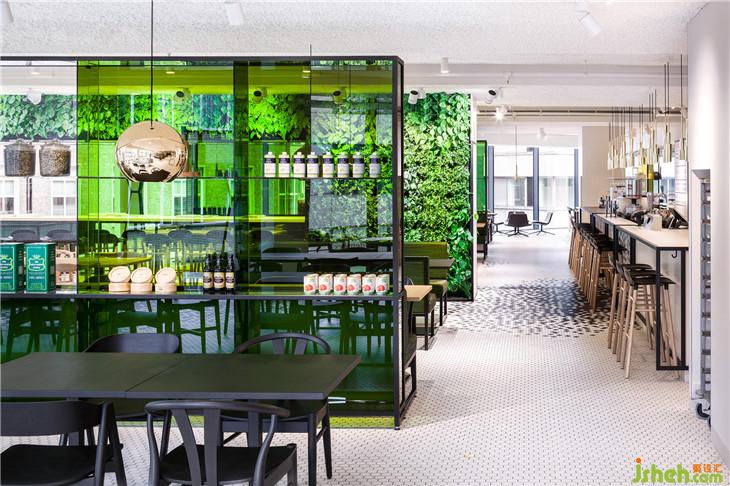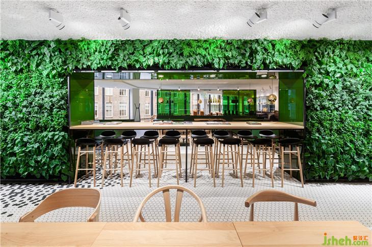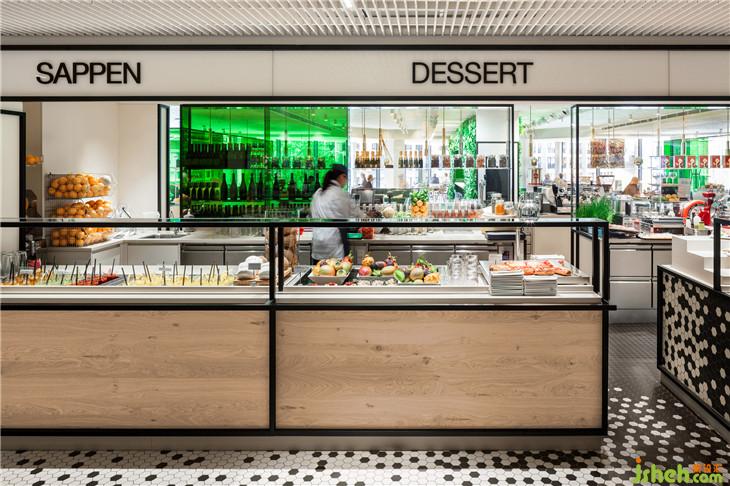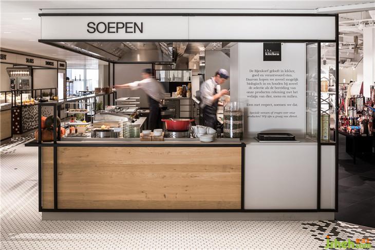 靈感來自于公司名稱De Bijenkorf (beehive),它的六邊形標志指的是一個蜂巢,i29設計了一個生動的黑色六邊形瓷磚圖案,接縫“聚集”在輕地板、酒吧和柜臺前面。