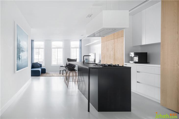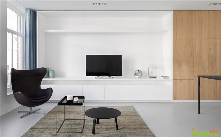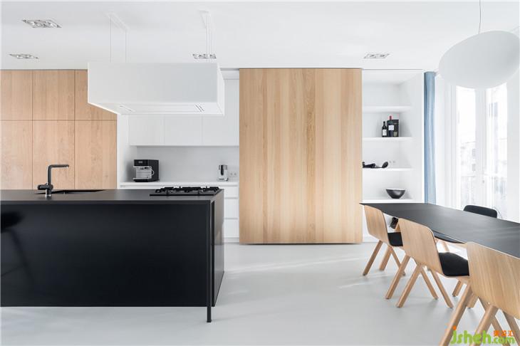 包括櫥柜,電視柜和專門設(shè)計(jì)的廚房,都可以可以通過大型橡木墻完全隔離。 一個(gè)對(duì)比鮮明的黑色廚房被放置在這個(gè)空間的中心。