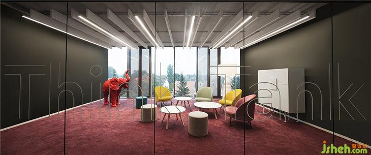員工餐廳不僅是享用午飯的地方,又是員工之間的交流最多的地點(diǎn)之一。為營(yíng)造不同風(fēng)格的就餐氛圍,餐廳布置了多人使用的大長(zhǎng)桌、小隔間、酒吧高桌以及三人用小圓桌等不同餐位,讓員工根據(jù)自身的需求選擇就餐環(huán)境。紅色的鐵質(zhì)框架在食堂餐桌上方,在沒(méi)有任何空間障礙的情況下有效劃分空間;黃色的簡(jiǎn)約吊燈和藍(lán)色的吊頂面板與紅色框架相呼應(yīng),為餐廳賦予一些活力。