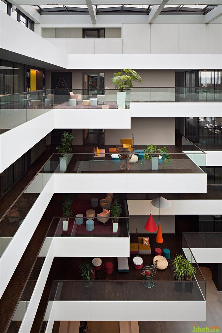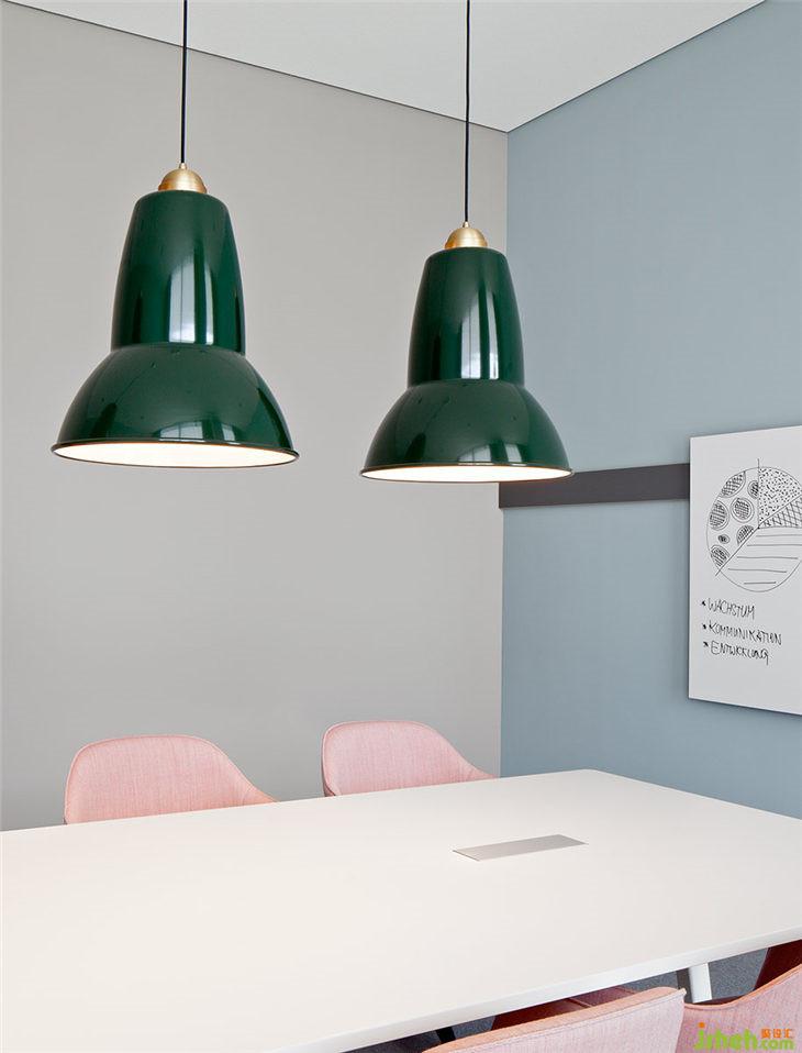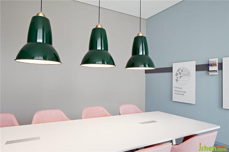 AEB總部每一層都有一個(gè)主題房間,這些可用于進(jìn)行大型會(huì)議或進(jìn)行更為深入的團(tuán)隊(duì)工作。吧臺(tái)椅放置在松軟的地毯上,與落地?zé)艉托还裣嘟Y(jié)合,讓這間會(huì)議室轉(zhuǎn)變成‘思想起居室’。會(huì)議室中紅色的大象雕塑看似突兀,但它鼓勵(lì)參與者可以發(fā)揮充分地創(chuàng)意和想象。四層角落的長(zhǎng)椅和復(fù)古風(fēng)格的椅子等傳統(tǒng)家具在簡(jiǎn)約又現(xiàn)代的裝修環(huán)境中創(chuàng)造了一個(gè)樸實(shí)但并不保守的工作氛圍。一個(gè)大型工作臺(tái)和裝飾吊頂與獨(dú)特設(shè)計(jì)的吊燈相結(jié)合,讓冰冷的會(huì)議室變成一個(gè)活躍的靈感源泉。旁邊的‘?dāng)?shù)字化實(shí)驗(yàn)室’則是為科技愛(ài)好者提供的用來(lái)測(cè)試領(lǐng)先技術(shù)、進(jìn)行研究、3D打印以及展示VR技術(shù)的場(chǎng)所。