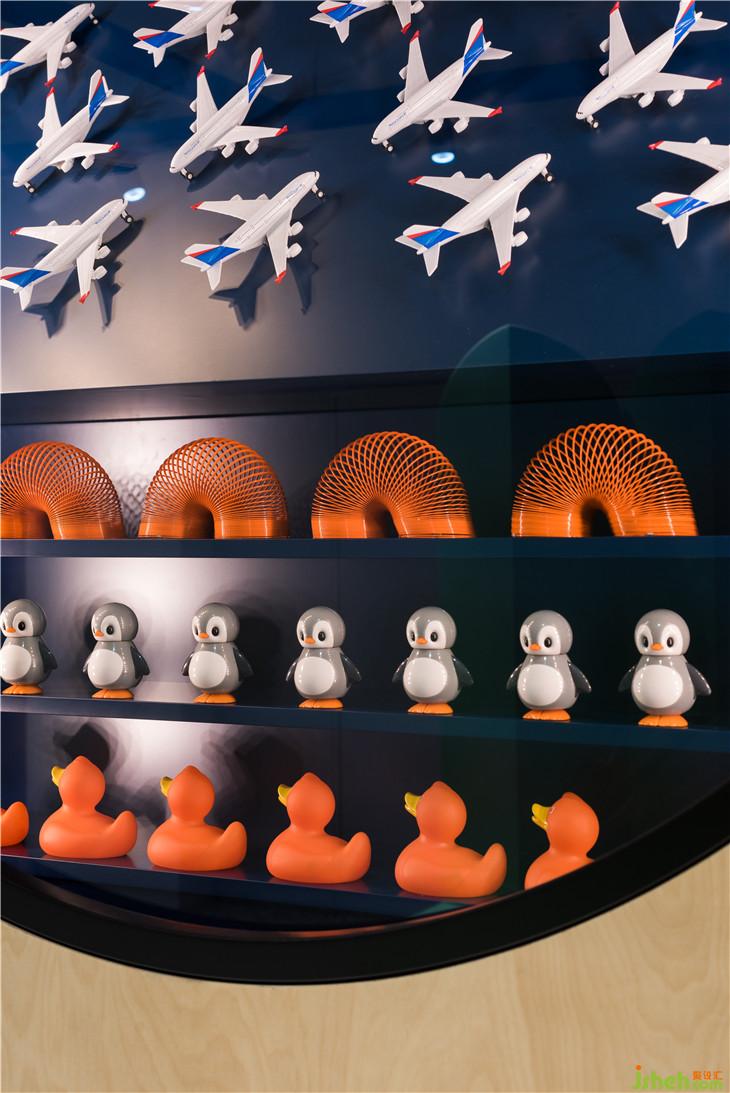 入口處墻面上的圓形展示窗口陳列著各式經(jīng)典玩具,喚起人們熟悉的記憶,同時標(biāo)識著棋盤游戲的開始。