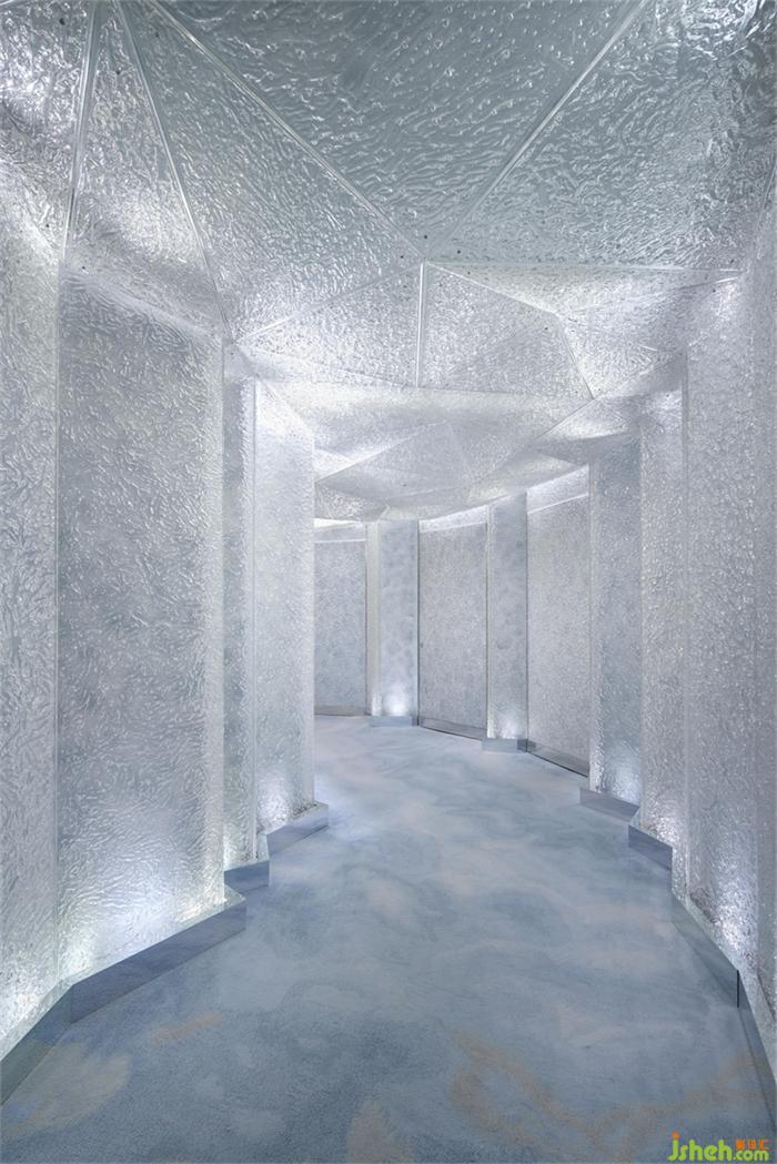 精品店的入口被水晶玻璃制作而成的冰墻所覆蓋,猶如踏入一座冰封千年的童話王國,卡地亞精品店設(shè)計不規(guī)則的天花板和墻板渾然一體,像穿梭在冰川中,凌烈卻變幻莫測。