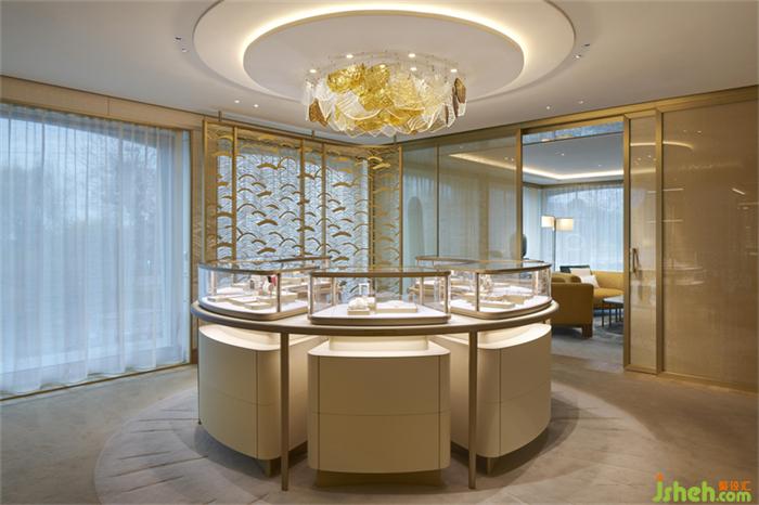 卡地亞精品店設(shè)計師通過幾組不同的藝術(shù)吊燈,將室內(nèi)空間進(jìn)行了無形的切割,圓形的展示柜方便客戶近距離觀察珠寶首飾。VIP客戶休息區(qū)利用夾絲玻璃作為隔斷,即保護(hù)了隱私,又讓空間有效流動,內(nèi)外溝通。