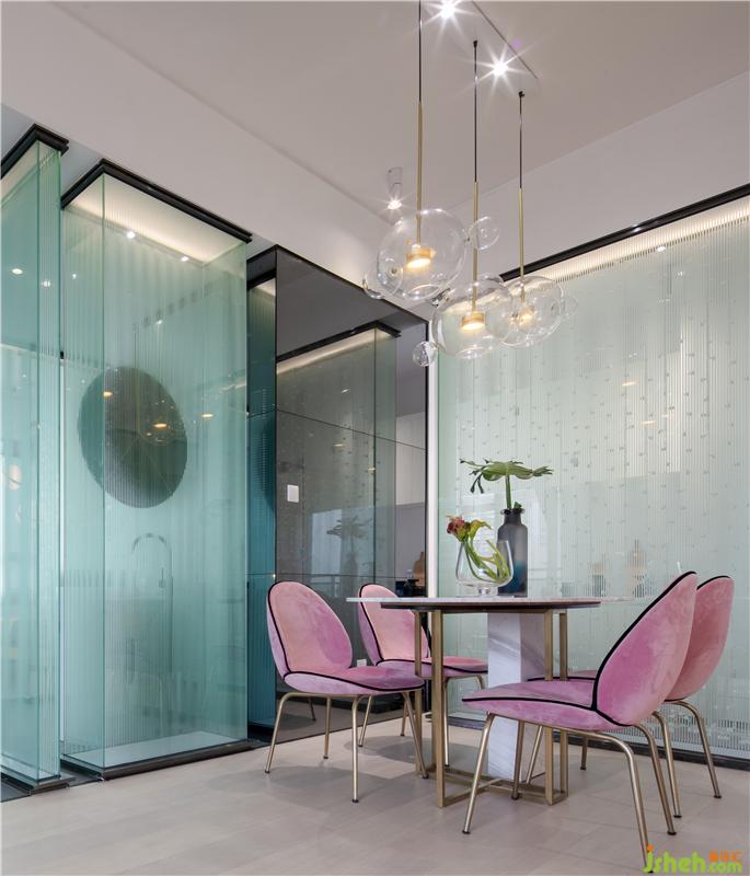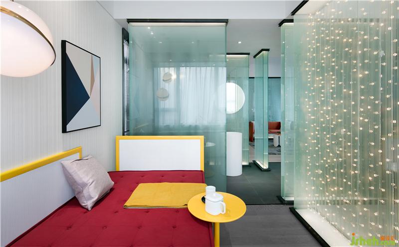 設(shè)計師完全摒棄實墻來分割空間,采用玻璃的塊面完全通透處理,分別劃分出臥室、書房及工作間各區(qū)域。在空間界面構(gòu)成中,我們通過塊面與線條的塑造打造一種使空間“空靈”的張力?!白鰷p法,不炫技,簡簡單單,干干凈凈”是設(shè)計師對項目設(shè)計的把握——不考慮奢華的裝飾性,只通過軟裝對業(yè)主生活品位及時尚喜好,作清簡的表達(dá)。用純粹的建筑語言使空間變得空靈簡致,游走之中讓人心曠神怡。
