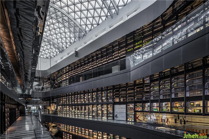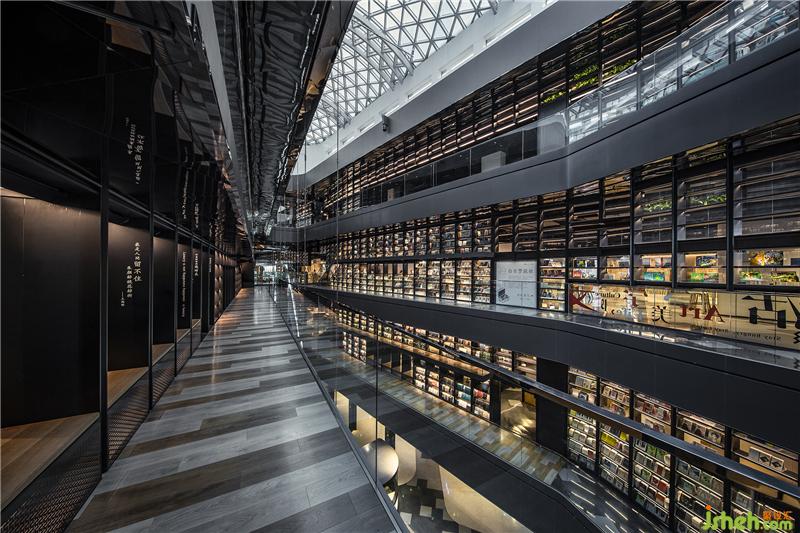 一樓到四樓,南面延伸至北面,在漫灑的天光映襯下,巨匯設(shè)計(jì)置入了兩道量體書(shū)墻,層高18米、全長(zhǎng)240米的尺度為全中國(guó)之最,使喧鬧的商業(yè)空間卻有著殿堂般儀式性的感動(dòng)與震撼。