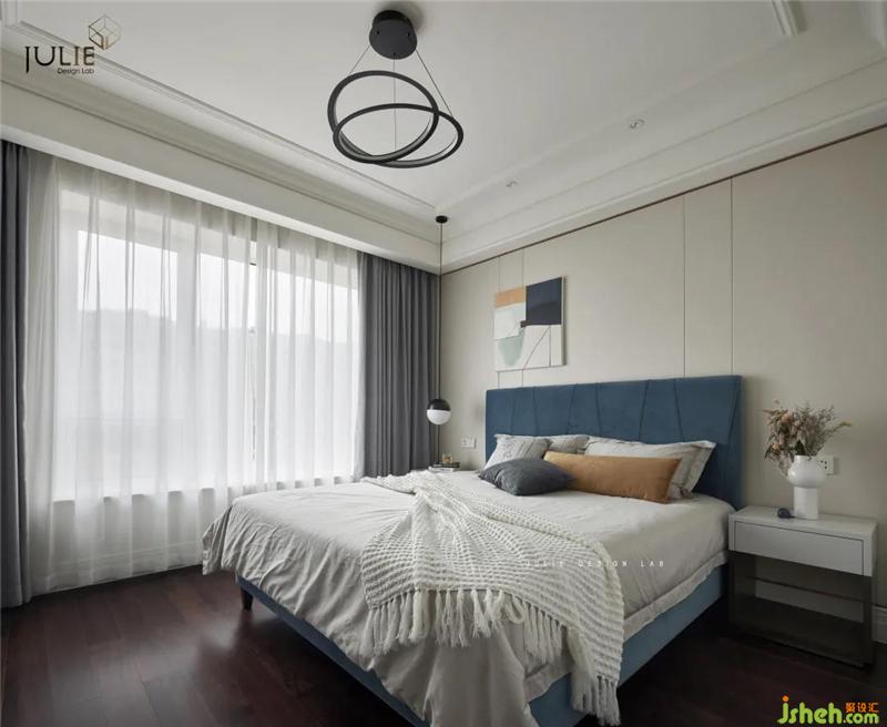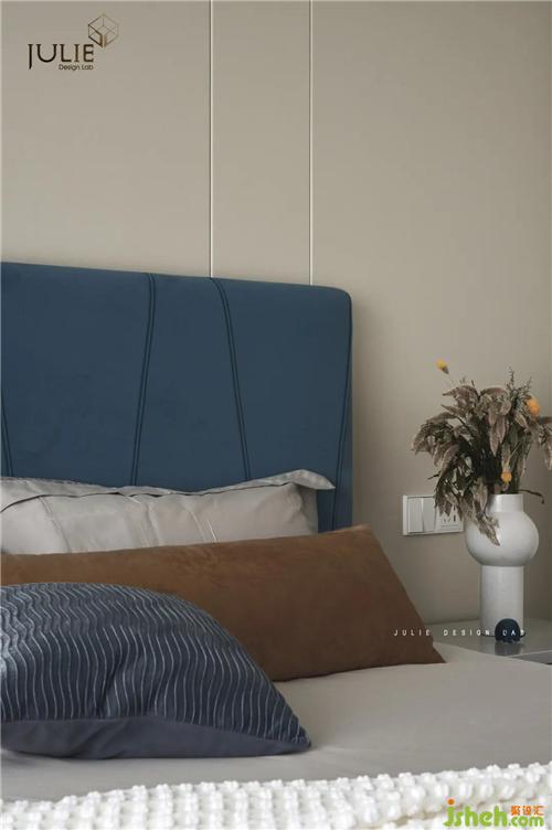簡約的拼色線條壁畫搭配霧霾藍(lán)的床