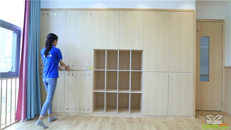 被子收納體系,托育中心設計各個床墊可以攤開分層放置,有效殺菌、散汗味。