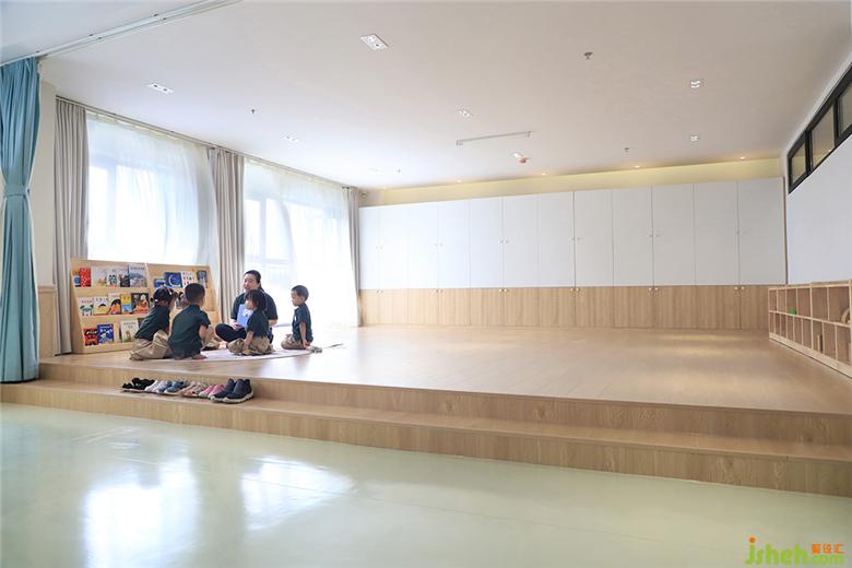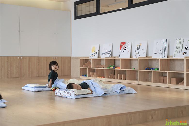 平時(shí)是建構(gòu)區(qū)、課間是繪本區(qū)、午休時(shí)拉上窗簾形成榻榻米睡室,后邊整面墻收納柜和睡被柜一體,方便孩子和老師拿取,培養(yǎng)孩子的自主性。