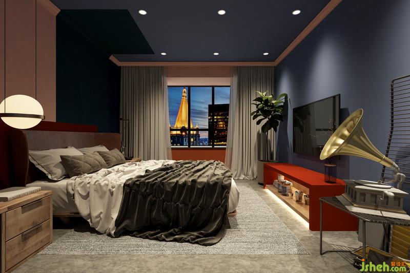 臥室里留聲機(jī)的放置,既吻合業(yè)主音樂人的身份,且金屬元素的添加使得家居時(shí)尚感大大提升。很多網(wǎng)紅家居里面都出現(xiàn)過金屬,特別是黃銅元素的運(yùn)用,黃銅除了自帶光芒以外,還為低飽和度的空間增添了更大的氣場。
