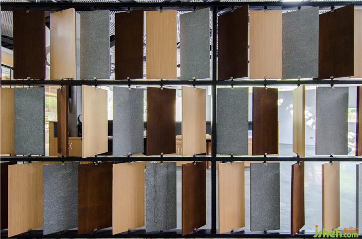 服務(wù)臺屏風(fēng)采用了三種空間主要材料來制作,將材料加工為固定規(guī)格并在上下中軸部位安裝轉(zhuǎn)軸配件,使其可以在金屬屏風(fēng)層架中360度任意旋轉(zhuǎn),增加趣味性的同時(shí)也增強(qiáng)了人與空間的互動。
