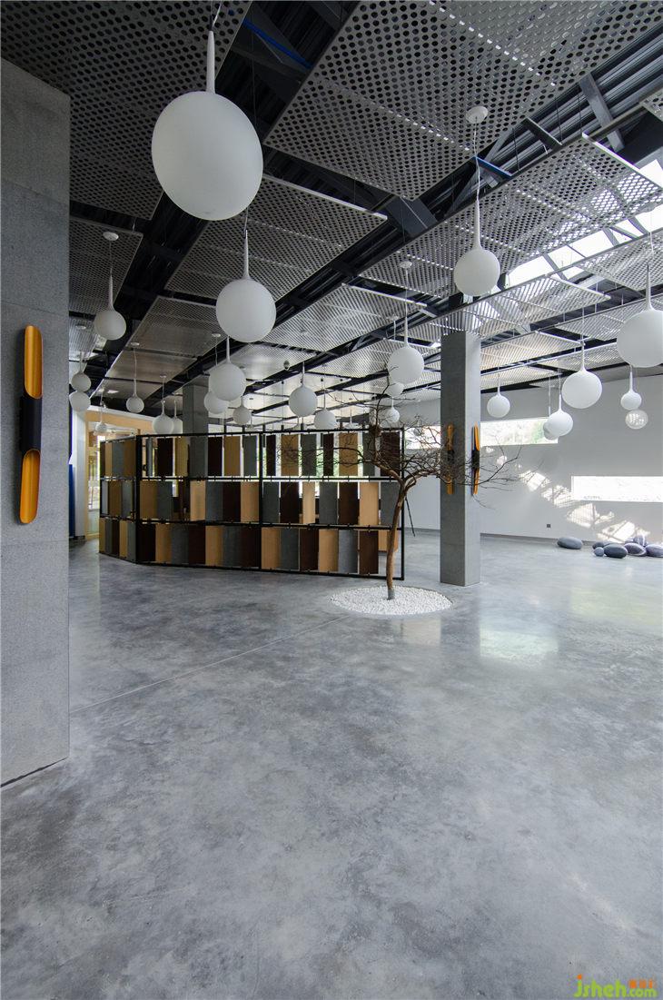 室內(nèi)頂面穿孔金屬板將無序的天花結(jié)構(gòu)及管線設(shè)施在視覺上做了一個(gè)整理,既讓天花能形成良好的統(tǒng)一感,又不妨礙頂部的采光天窗將光線引進(jìn)室內(nèi),圓孔的處理在室內(nèi)形成了特殊的光影效果。銀色的反光金屬板材質(zhì)在視覺上也具有輕盈性。以此可在空間上建立起一種新的秩序。