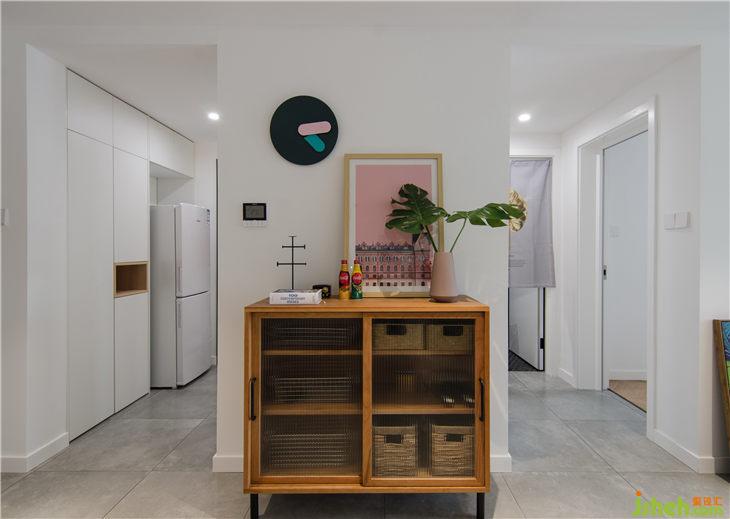 1.將原有廚房的一部分面積分離出來(lái),作為入戶(hù)衣帽區(qū),承擔(dān)了玄關(guān)的收納與換鞋功能,并預(yù)留了冰箱的位置。
