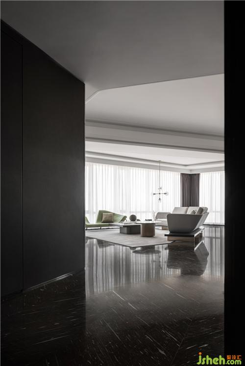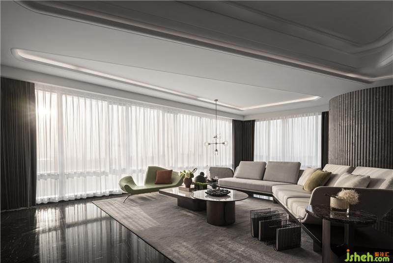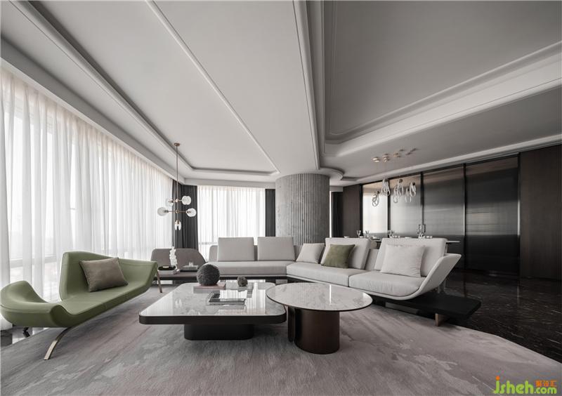 卡納設計將靈感放眼于自然景觀,山川與湖海是自然最偉大的造物,他們均帶有渾然天成的有機弧線,從中提煉線條與氣魄,為空間造就剛與柔并濟的輪廓,與有波浪造型的建筑的外立面形成呼應,青島樣板房設計借助大面積的景觀優(yōu)勢以打造“姿態(tài)優(yōu)雅的景觀豪宅”作為設計的切入點,將室內、建筑與景觀融會貫通,也把海天中心的品牌文化做進一步的延伸。